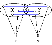 c) viszont igaz: ha egy gráfban nincs telített pont, bármely két össze nem kötött pontnak pontosan egy közös szomszéda van, összekötött pontoknak nincs közös szomszédjuk, akkor a gráf reguláris. Most ezt fogjuk bebizonyítani. Először azt bizonyítjuk, hogy ha két pont nincs összekötve, akkor azonos a fokszámuk. Legyen x és y két össze nem kötött pont a gráfban, X és Y legyen x illetve y szomszédainak halmaza. A feltétel szerint X-nek és Y-nak pontosan egy közös pontja van és X-ben, Y-ban nem fut él. Legyen z a közös pont és legyen u X egy tetszőleges, z-től különböző pontja.