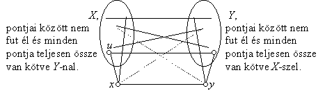 HOL A HIBA az elmondott bizonyításban? Hol használtuk ki, hogy nincs a gráfban telített pont? A hiba ott van, hogy feltettük, hogy ha x és y között fut él, akkor van olyan pont, amellyel egyikük sincs összekötve. Ez nem biztos, és nincs is rá szükségünk. Most megmutatjuk, hogy lehet jól befejezni ezt a bizonyítást. Tekintsünk két olyan pontot, amelyek között fut él a gráfban, legyenek ezek x és y. Legyen X x-nek y-tól különböző szomszédai halmaza. Hasonlóan definiáljuk Y-t is. A feladat feltétele szerint e két halmaz diszjunkt és egyiken belül sem fut él. X pontjai nincsenek összekötve y-nal, tehát a már bizonyítottak szerint mindegyikük foka megegyezik y fokszámával. Ugyanígy Y pontjainak fokszáma megegyezik x fokszámával: